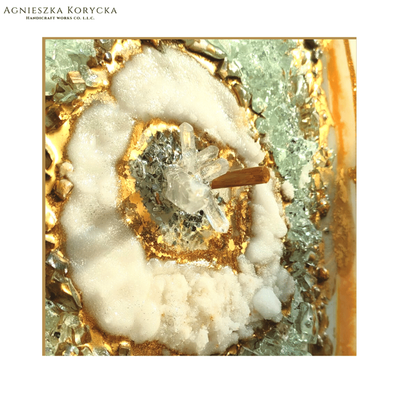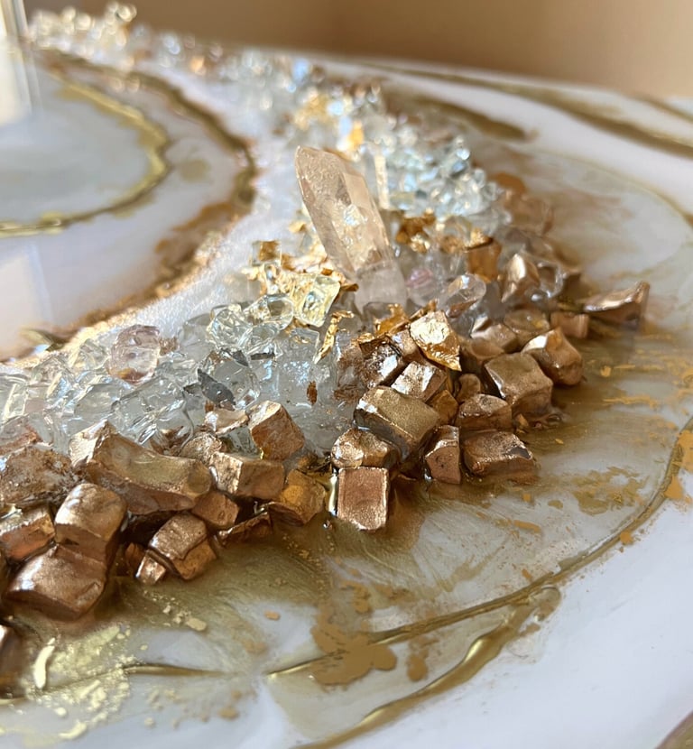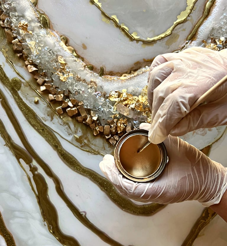 I am Agnieszka Korycka, a Dubai-based resin artist and the founder of ResinArtUAE. For more than eight years I have been working almost exclusively with epoxy resin, creating large-scale paintings, sculptures, and functional art pieces enriched with crystals and metallic pigments.