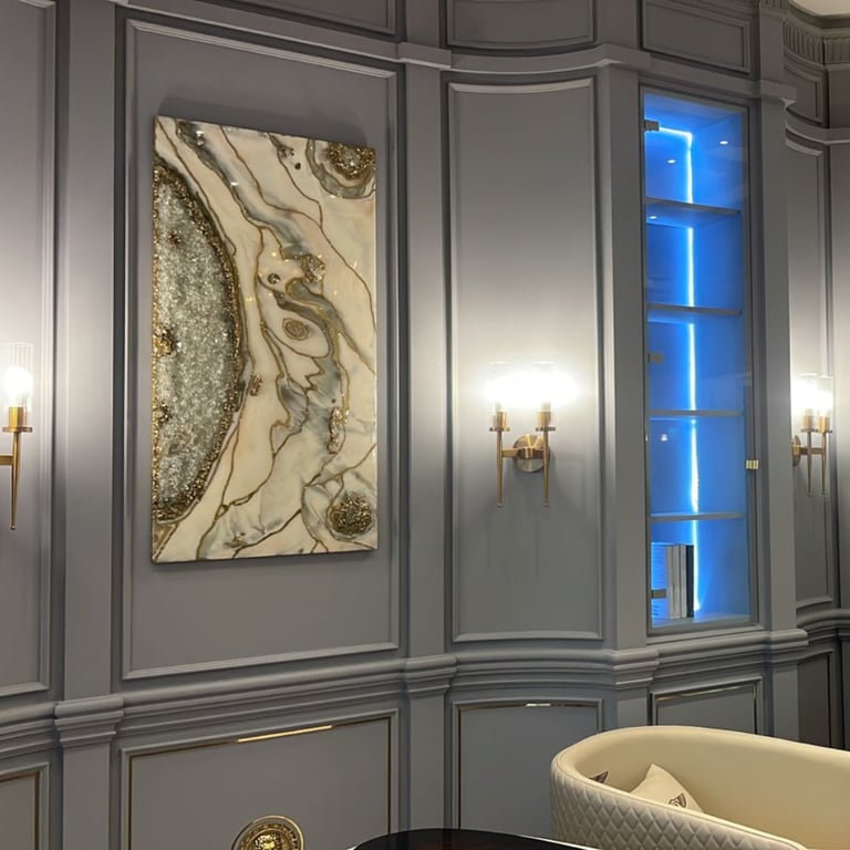 My works have been exhibited at DIFC Art Nights three times and are part of private collections across the UAE and Europe. I also collaborated with luxury venues such as Huqqa, designing bespoke resin projects that merge art, design, and experience.